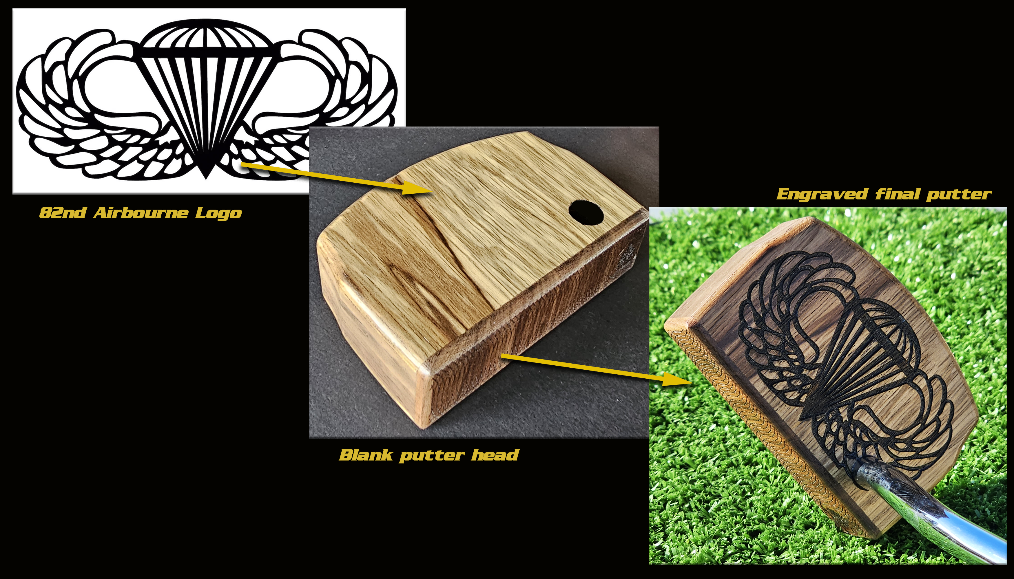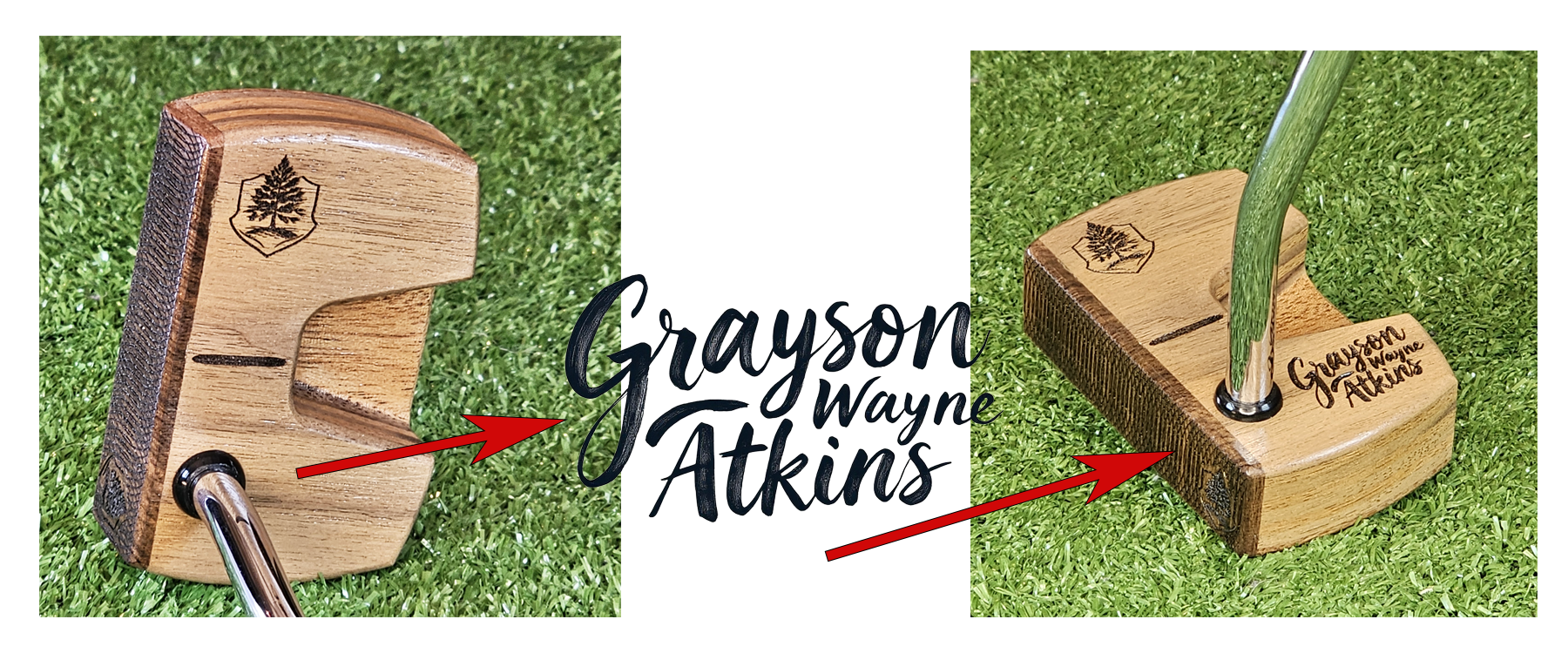 Here is how it works. Select a putter from our site and click the "Custom Engraved" option. When completing checkout, add information in the notes area as to what you want on the putter (if you do not see this, you can email us through the site). This can be a graphic, text or some combination that you work with us to add. This custom engraving is added just behind the shaft as shown on the left.