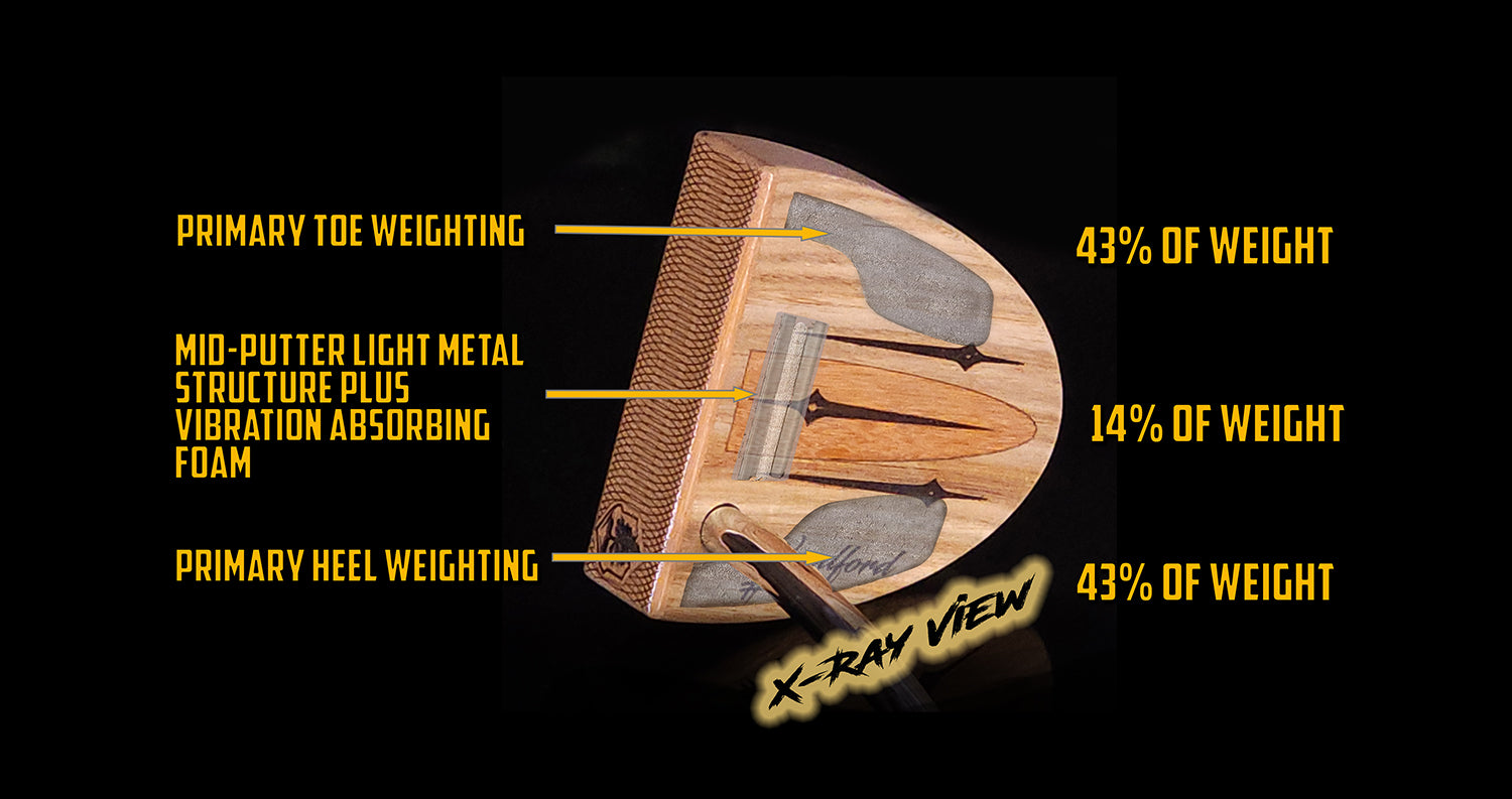 Our putters generally weigh around 370 grams, yet the wood used in the putter head is only about 70 grams. This allows us significantly more discretionary mass placement than any other putter available. We use this feature to achieve the perfect weight distribution, giving our putters a very high MOI, which enhances stability and consistency during your stroke.